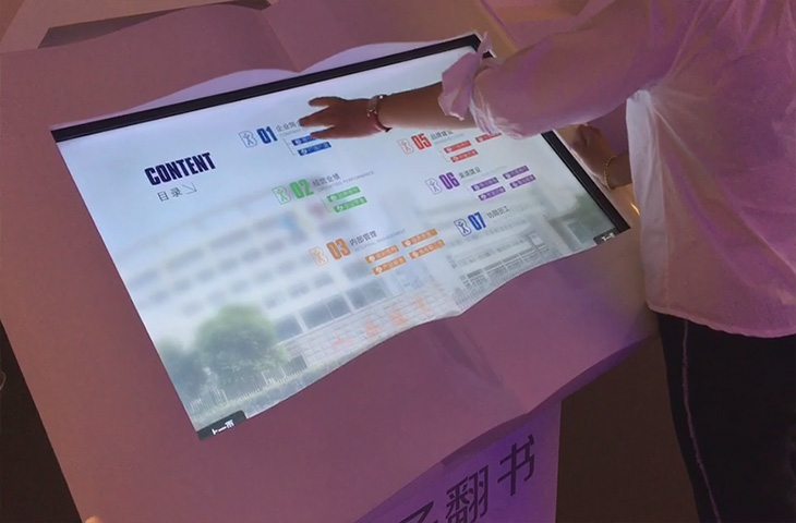 觸摸屏電子翻書:電子翻書原理是利用觸控方式獲取參觀者的動作,并將該動作傳輸紿計算機進行處理,計算機內的應用程序則根據所捕捉的信號驅動多媒體動畫進行翻書的效果表現。