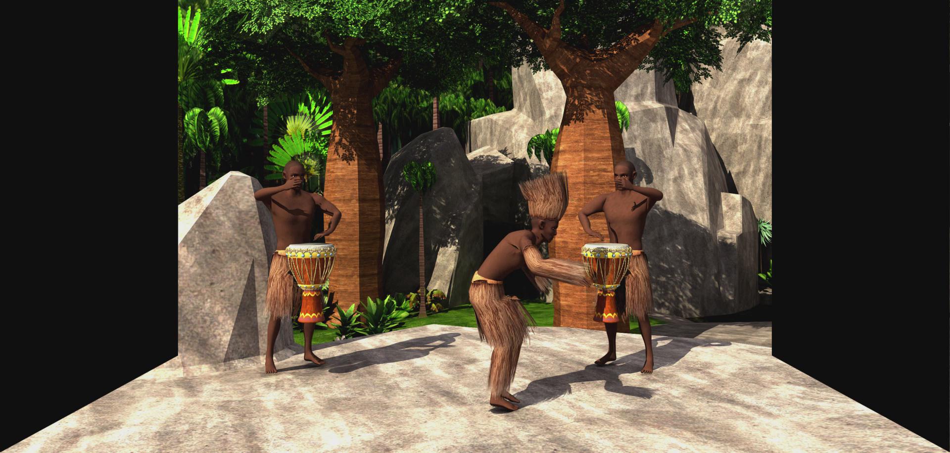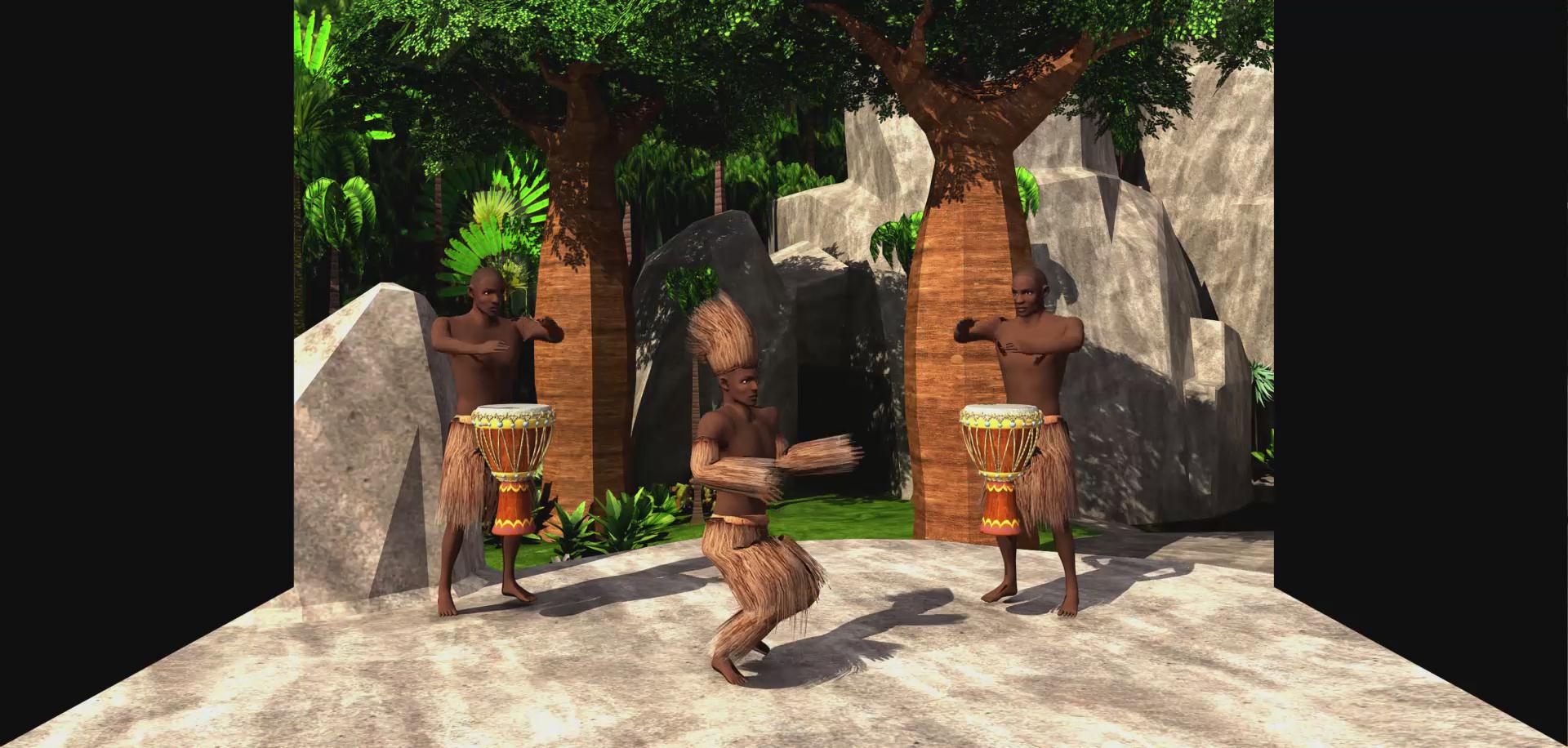 坎科冉是塞內(nèi)加爾和岡比亞的曼丁人地區(qū)的一種成年禮,相當(dāng)于“卡薩曼斯”(Casamance)。坎科冉儀式主要的特征是:受成年禮者帶著用樹皮和faara樹的紅根須做成的面具,穿著樹葉做成的衣服,用蔬菜漿汁涂畫全身。該影片利用三維動(dòng)畫形象描述了坎科冉或曼丁成人禮的效果,體現(xiàn)了曼丁的文化特性,立體效果強(qiáng)烈。